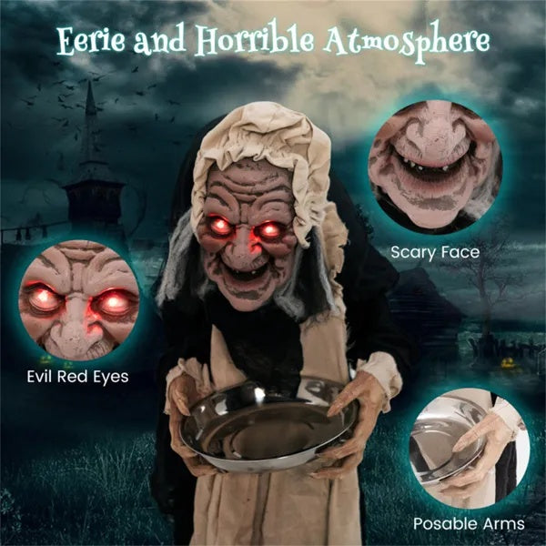 ● Terrifying Existence for Halloween: The life-size Halloween old lady is wearing a maid's costume and holding a candy tray, which seems to wait for the arrival of trick-or-treaters. Her hunched body, scary face, evil red eyes and posable arms create a realistic look, enhancing eerie and horrible atmosphere.